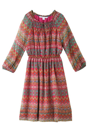 オリエンタルなプリント柄と切り替えが目を惹くワンピース 様々な柄の切り替えがオリエンタルムードを漂わせる個性的なラップワンピース。鮮やかなピンクのグラデ-ションが印象的。袖や裾の透け感のあるふんわりとしたシフォン素材やフリル、ウエストのリボンで甘さをプラスした、ロマンチックで華やかな一枚。